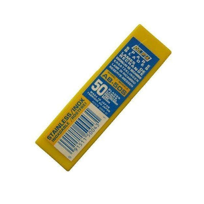 Gult OLFA-blademballage med 50 rustfri knivblade, mærket "AB-50S" og stregkode nederst.