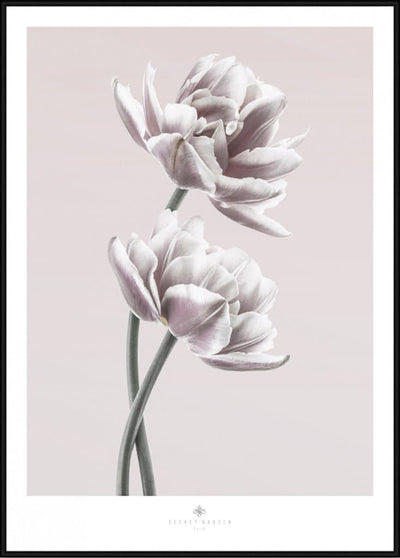 To lyserøde tulipaner mod en rosa baggrund med hvid kant og Secret Garden-logo nederst.