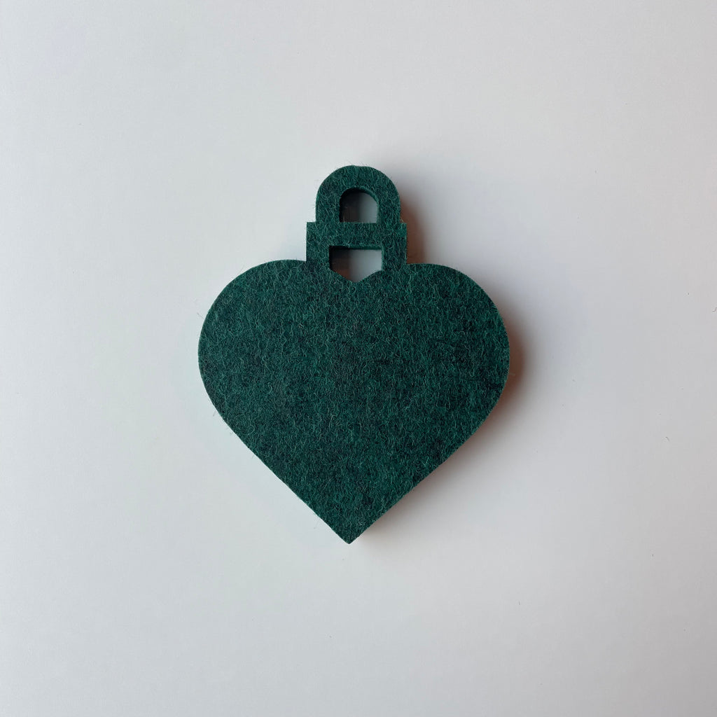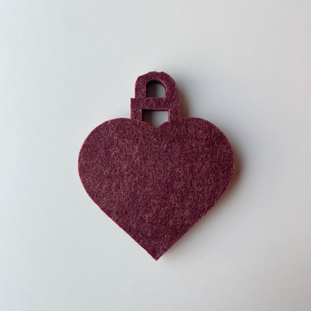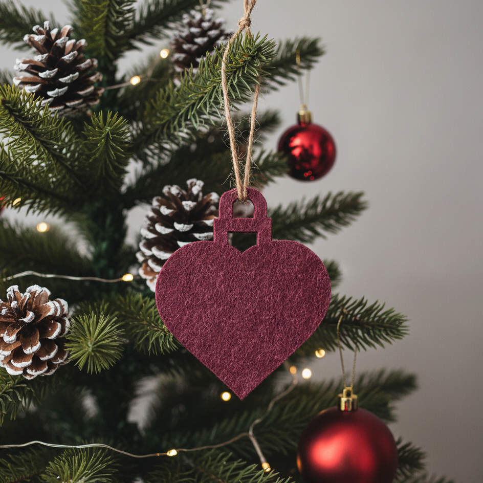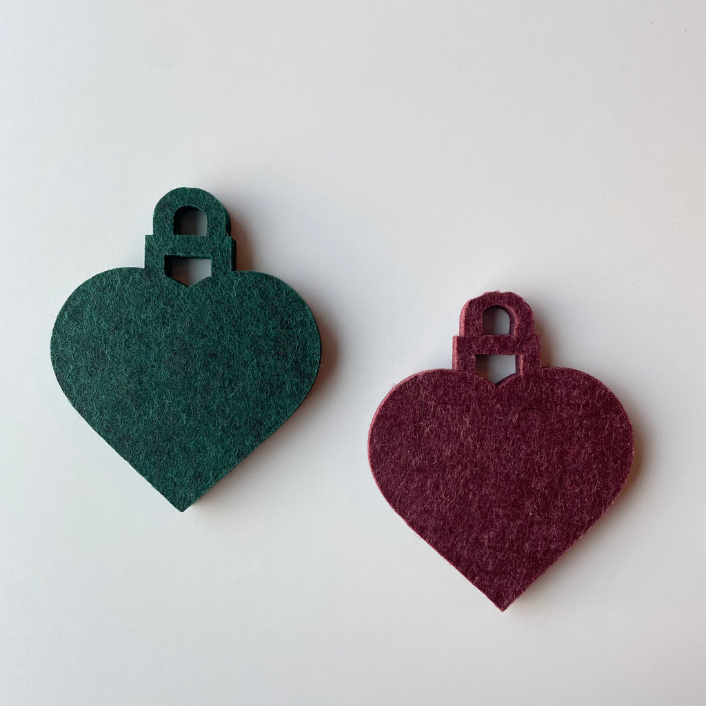 Flot julekugle hjerte udskåret i 9 mm filt akustikplade. Julekuglen formet som et hjerte er en flot udsmykning til jul.