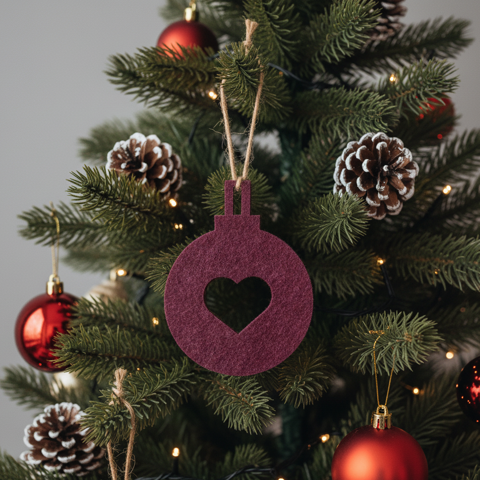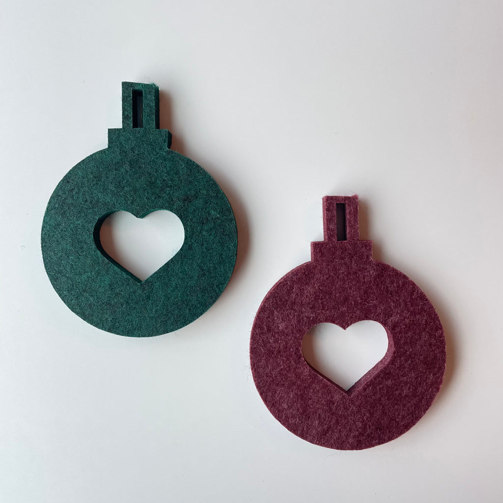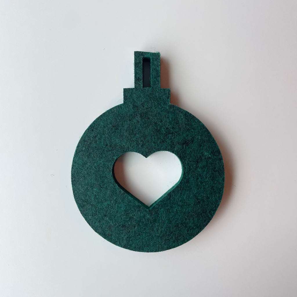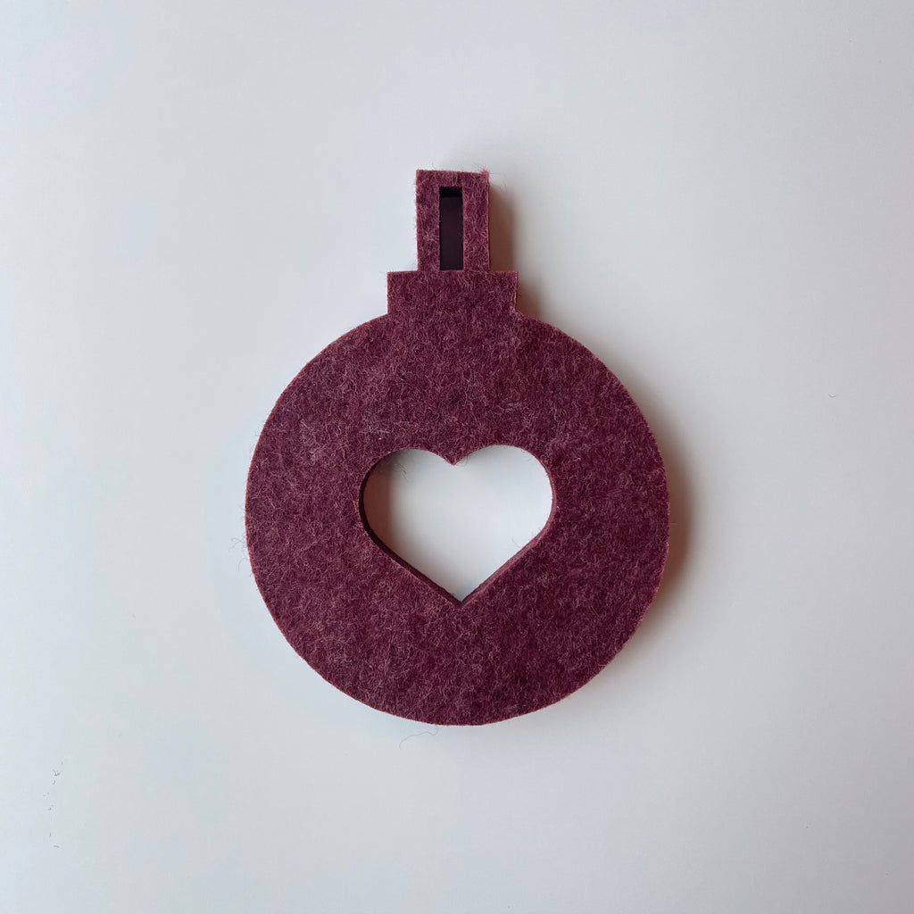 Julekugle med hjerte udskåret i 9 mm filt akustik