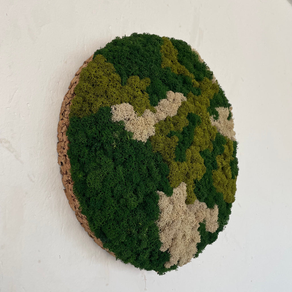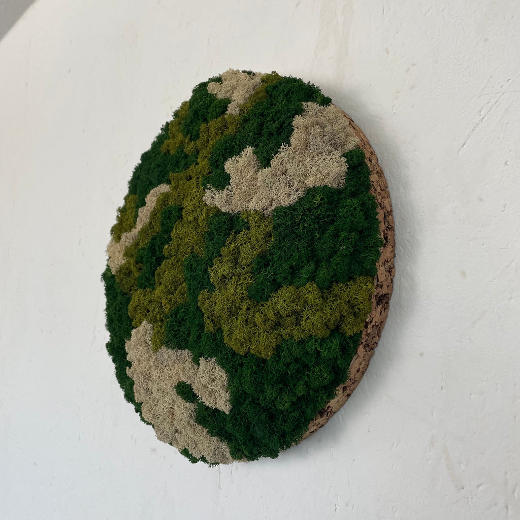 OEKOBOARD Basic - Blandet mos cirkel - Mix neutral kombinerer æstetik og et naturligt look i et særligt mospanel. Dette produkt tilbyder en naturlig løsning til indretning med en lang holdbarhed på 7-10 år, hvis grundregler overholdes, såsom ingen vanding og ingen direkte sollys.