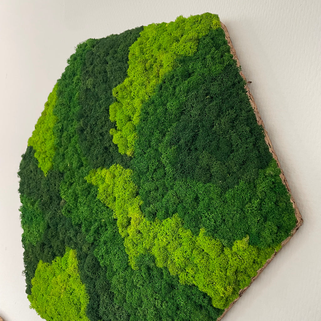 Materialer: Bunden er lavet i kork hvorpå der med vandbaseret lim er påført tre grønne nuancer reindeer mos. Mosset er præserveret med en form for frugtfarve og kræver derfor ikke vedligehold. Det bevarer altså sin smukke farve og dets friske look uden at forfalde. De tre mos farver er lysgrøn, skovgrøn og mørkegrøn reindeer mos.