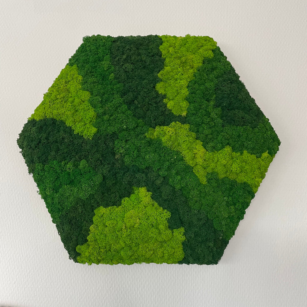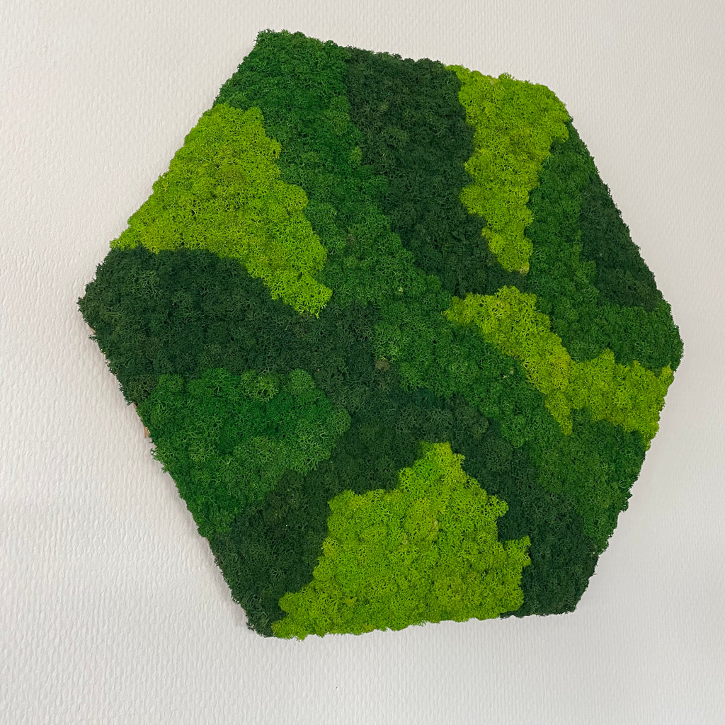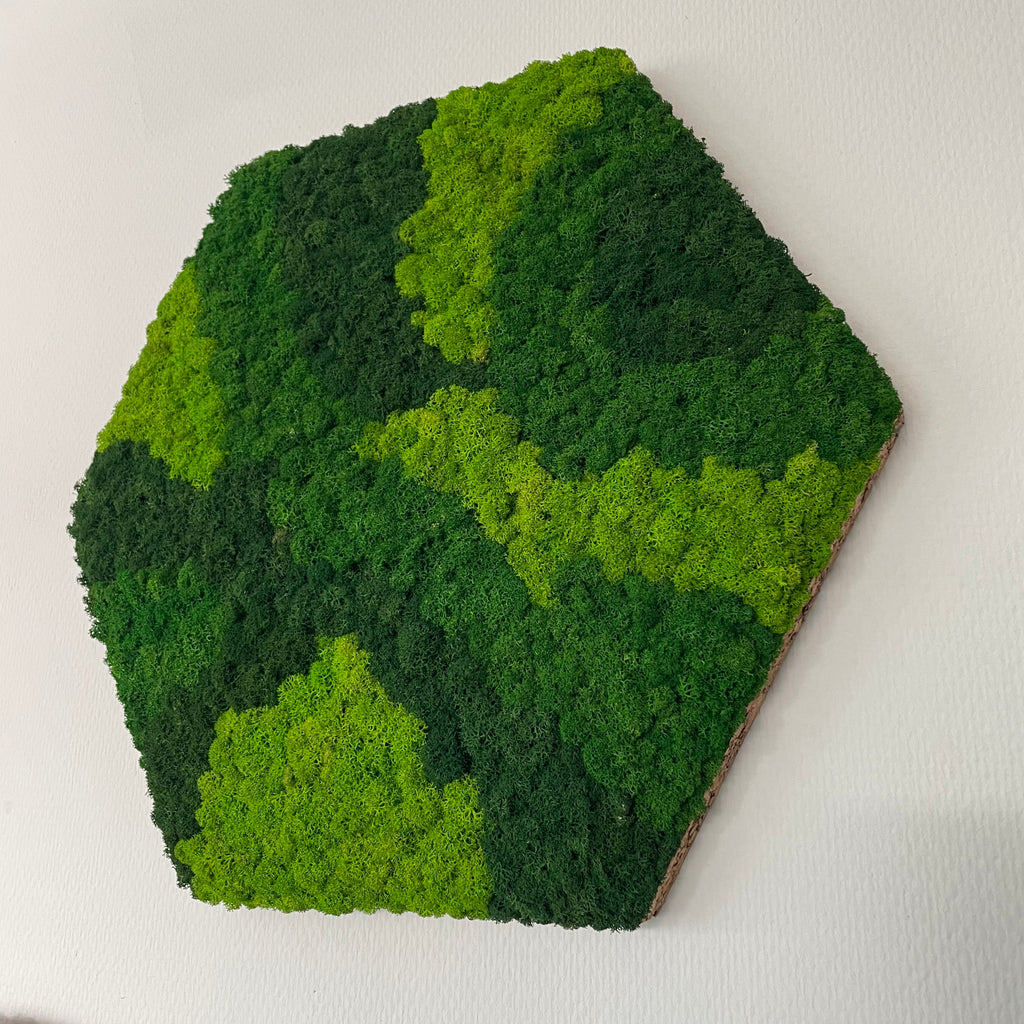 OEKOBOARD Basic er et produkt, hvor mosset ikke er finsorteret som vores Premium mosprodukter. Der kan derfor være synlige grannåle mm. i mosset. Basic produkterne er dermed et lidt billigere produkt, men samme kvalitetsmos. Dette OEKOBOARD er én sekskant lavet på en korkplade i en 2 cm. tykkelse og sekskanten er ca. 48 cm. i bredden.