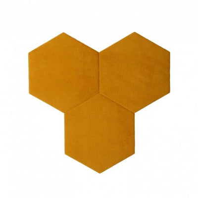 Tre gyldne, sekskantede paneler med blød tekstur samlet i et mønster.DECORK, textil, Guld