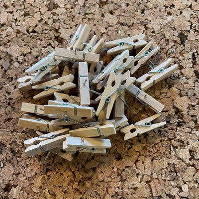 Små træclips med metalnål på korkoverflade, ligner miniature-tøjklemmer, flere i en bunke.Klemme med nål, træ