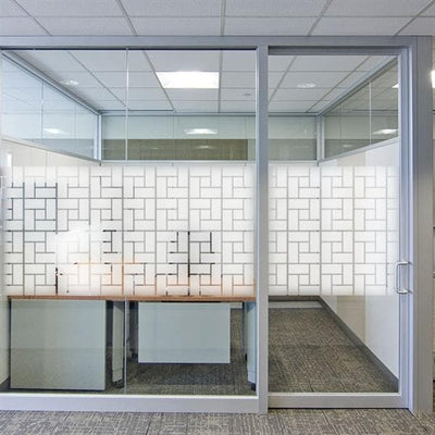 Kontor med glasvægge og sandblæst film i vandrette striber, der giver privatliv og lysgennemgang.