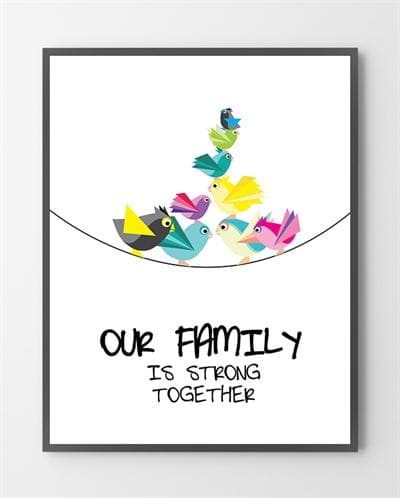 Plakat med farverige fugle på ledninger og teksten "Welcome In My Home," i ramme.