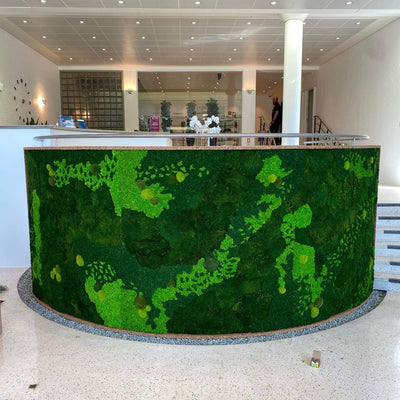 Dekorativ vægpynt med "Pryssing" i kursiv og bladdesign på grøn baggrund.OEKOBOARD - Logo i reindeer mos