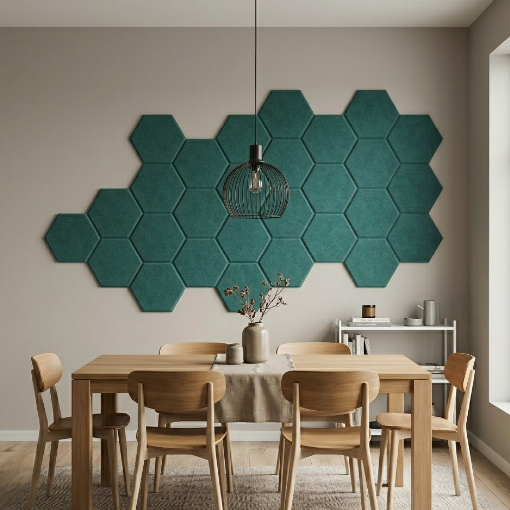 Disse akustikpaneler er testet for effektiv lydabsorbering og kan bidrage til forbedret rumklang. Panelernes hexagonale form og fleksible monteringsmuligheder giver kreativ frihed til at skabe forskellige mønstre på vægge og lofter, hvilket muliggør skræddersyede akustiske løsninger. Den danske produktion sikrer konsistent kvalitet og overholdelse af strenge miljø- og sikkerhedsstandarder.