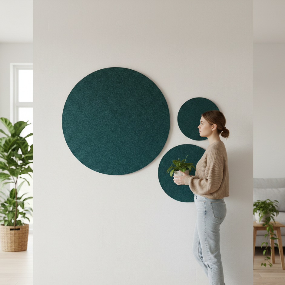Filt Akustikpanel cirkel 9 mm, Ø60 cm fra Liseborg. dk leverer dokumenteret lydabsorption med en NRC-værdi på 0,75. Dette betyder en reduktion af støjniveauet med op til 75 % i åbne kontorlandskaber og rum med hårde overflader. Som specialister i akustikløsninger tilbyder Liseborg skræddersyede løsninger til både bolig og erhverv.