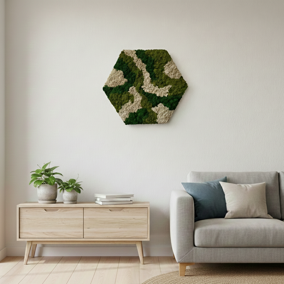 OEKOBOARD Basic er et produkt, hvor mosset ikke er finsorteret som vores Premium mosprodukter. Der kan derfor være synlige grannåle mm. i mosset. Basic produkterne er dermed et lidt billigere produkt, men samme kvalitetsmos. Dette OEKOBOARD er én sekskant lavet på en 2 cm tyk korkplade og sekskanten er ca. 48 cm. i bredden.