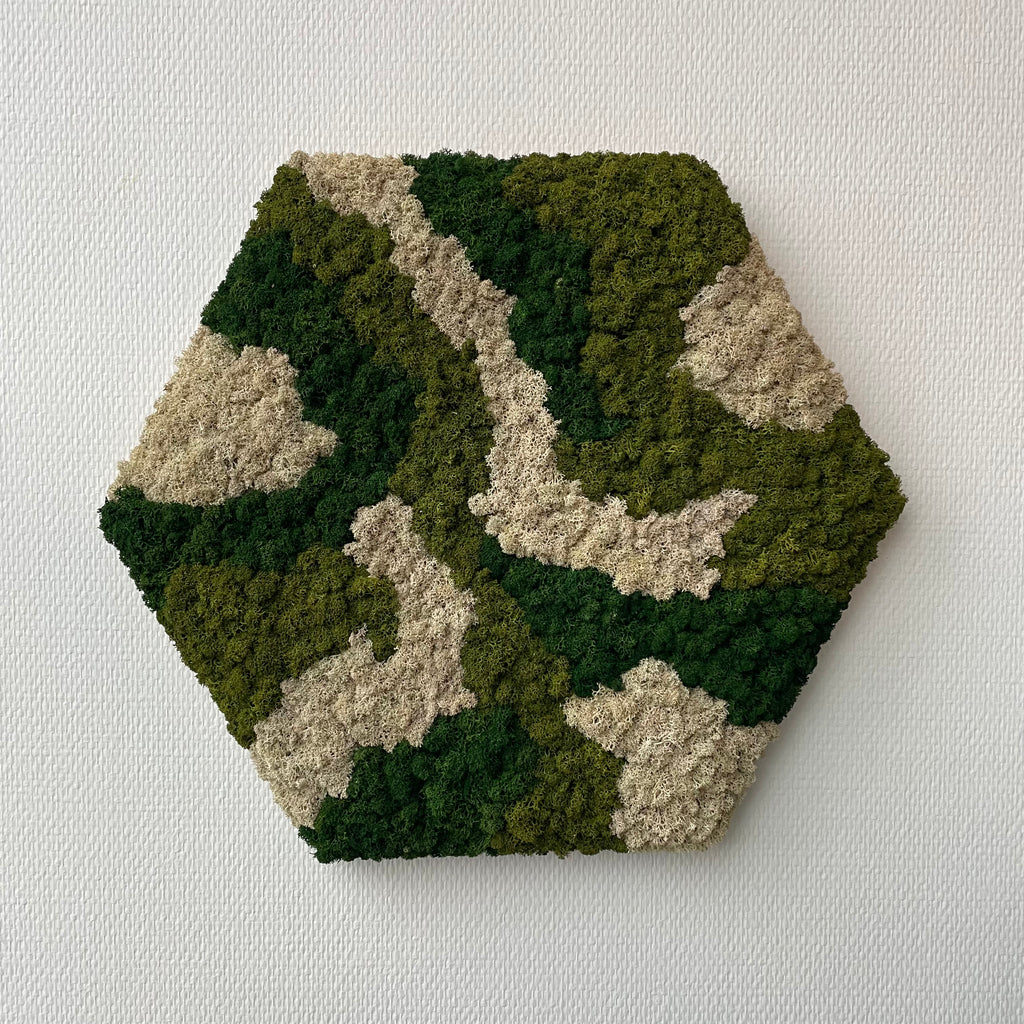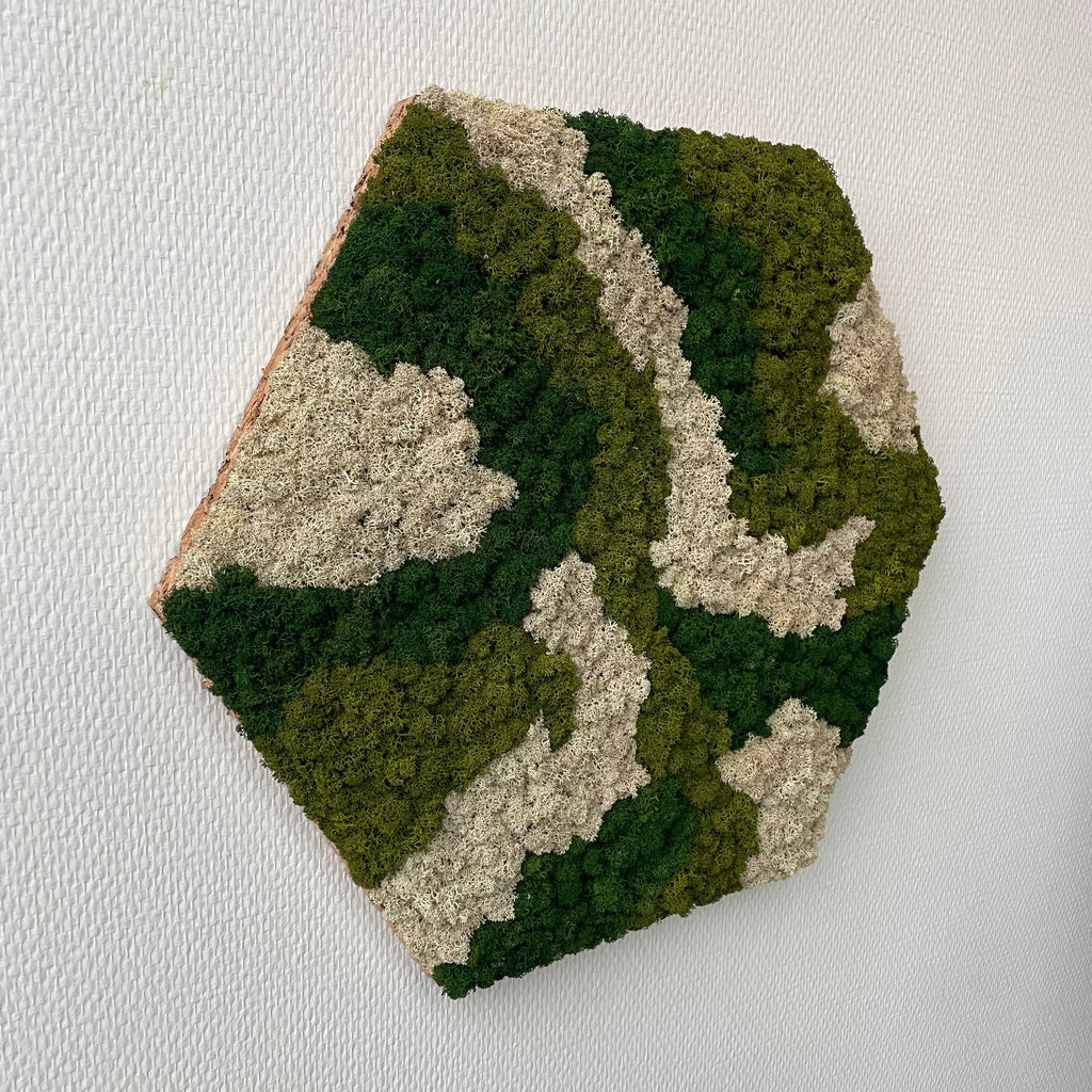 Materialer: Bunden er lavet i kork hvorpå der med vandbaseret lim er påført tre nuancer reindeer mos. Mosset er præserveret med en form for frugtfarve og kræver derfor ikke vedligehold. Det bevarer altså sin smukke farve og dets friske look uden at forfalde. De tre mos farver er neutral, mediumgrøn og mørkegrøn reindeer mos.