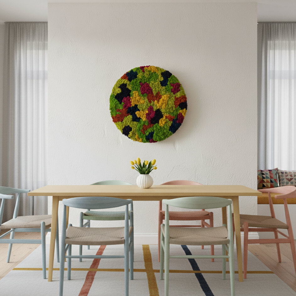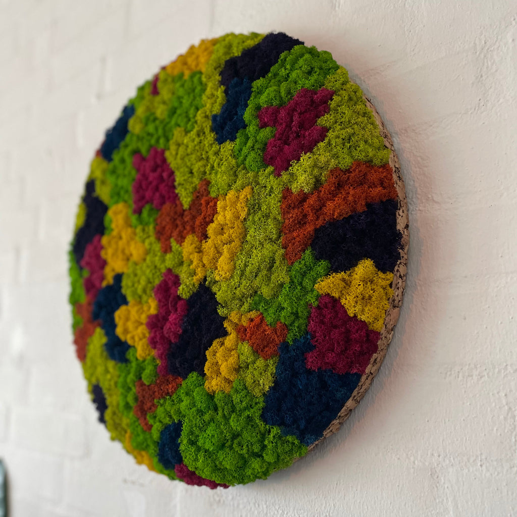 OEKOBOARD Basic - Mos cirkel - Multicolor kombinerer æstetik og funktionalitet i et særligt vægmodul. Dette produkt tilbyder en naturlig løsning til indretning med en lang holdbarhed på 7-10 år ved korrekt vedligeholdelse.