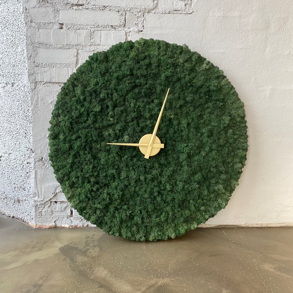 Materialer: Bunden er lavet i kork hvorpå der med vandbaseret lim er påført en mørk grøn mos. Mosset er præserveret med en form for frugtfarve og kræver derfor ikke vedligehold. Det bevarer altså sin smukke farve og dets friske look uden at forfalde. Ovenpå er der monteret et guld/messing ur.