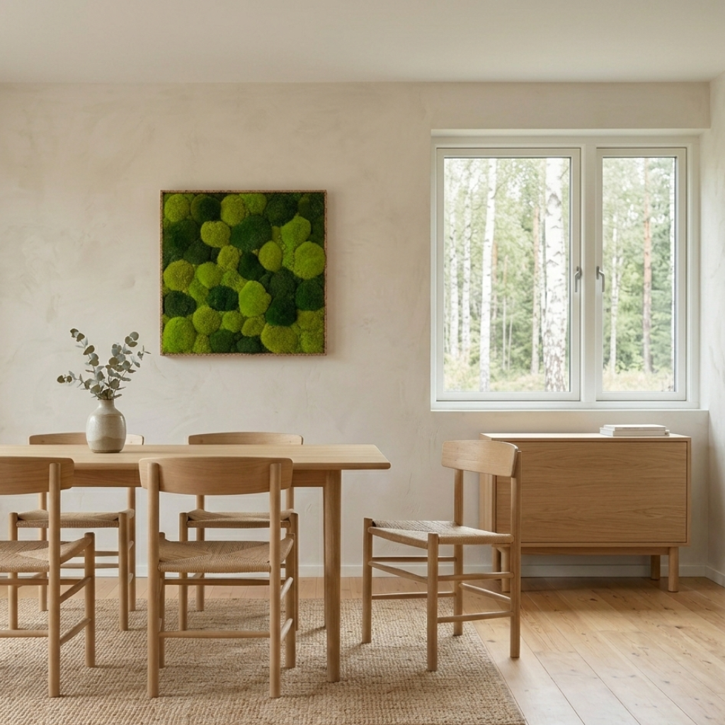 OEKOBOARD - Pudemos mix firkantet m/kork kant kombinerer æstetik og funktionalitet i et håndlavet vægmodul. Dette innovative produkt tilbyder en effektiv løsning til akustikforbedring, der udnytter naturmossets iboende lydabsorberende egenskaber. Mosvæggen har en dokumenteret akustikdæmpende effekt, hvilket gør den ideel til støjreduktion i forskellige miljøer. Målinger viser, at OEKOBOARD har en gennemsnitlig lydabsorptionskoefficient på 0,7, hvilket kan reducere efterklangstiden i et rum med op til 30%.