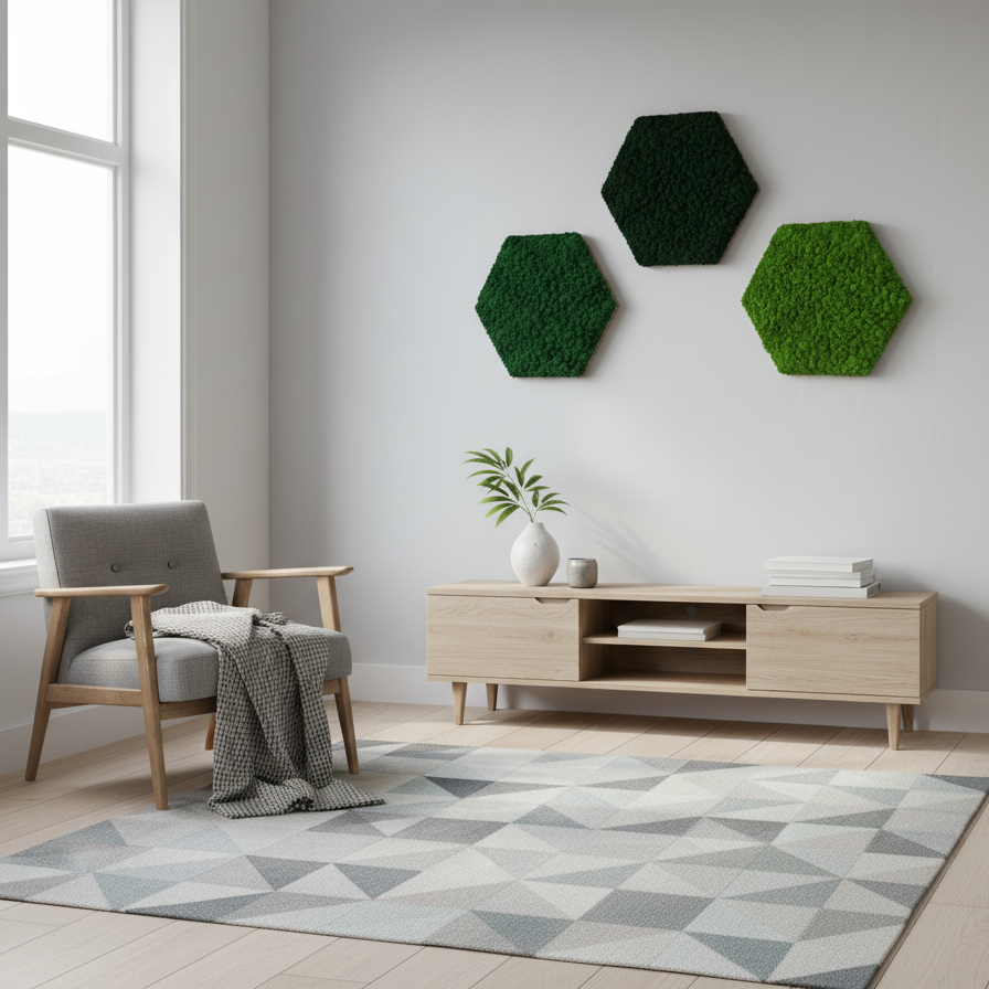 Materialer: Bunden er lavet i kork hvorpå der med vandbaseret lim er påført en grøn mos. Mosset er præserveret med en form for frugtfarve og kræver derfor ikke vedligehold. Det bevarer altså sin smukke farve og dets friske look uden at forfalde.